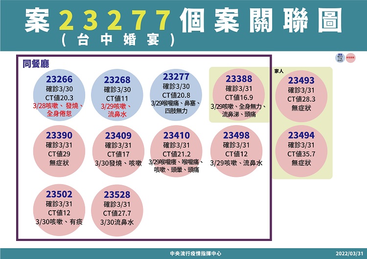 指揮中心統計,截至目前國內累計6,997,665例新型冠狀病毒肺炎相關通報(含6,973,938例排除),其中23,393例確診,分別為7,470例境外移入,15,869例本土病例,36例敦睦艦隊、3例航空器感染、1例不明及14例調查中;新增1例(案23190)空號病例,累計136例移除為空號。2020年起累計853例COVID-19死亡病例,其中839例本土,個案居住縣市分布為新北市413例、臺北市322例、基隆市29例、桃園市28例、彰化縣15例、新竹縣13例、臺中市5例、苗栗縣3例、宜蘭縣及花蓮縣各2例,新竹市、南投縣、雲林縣、臺南市、高雄市、屏東縣及臺東縣各1例;另14例為境外移入。
