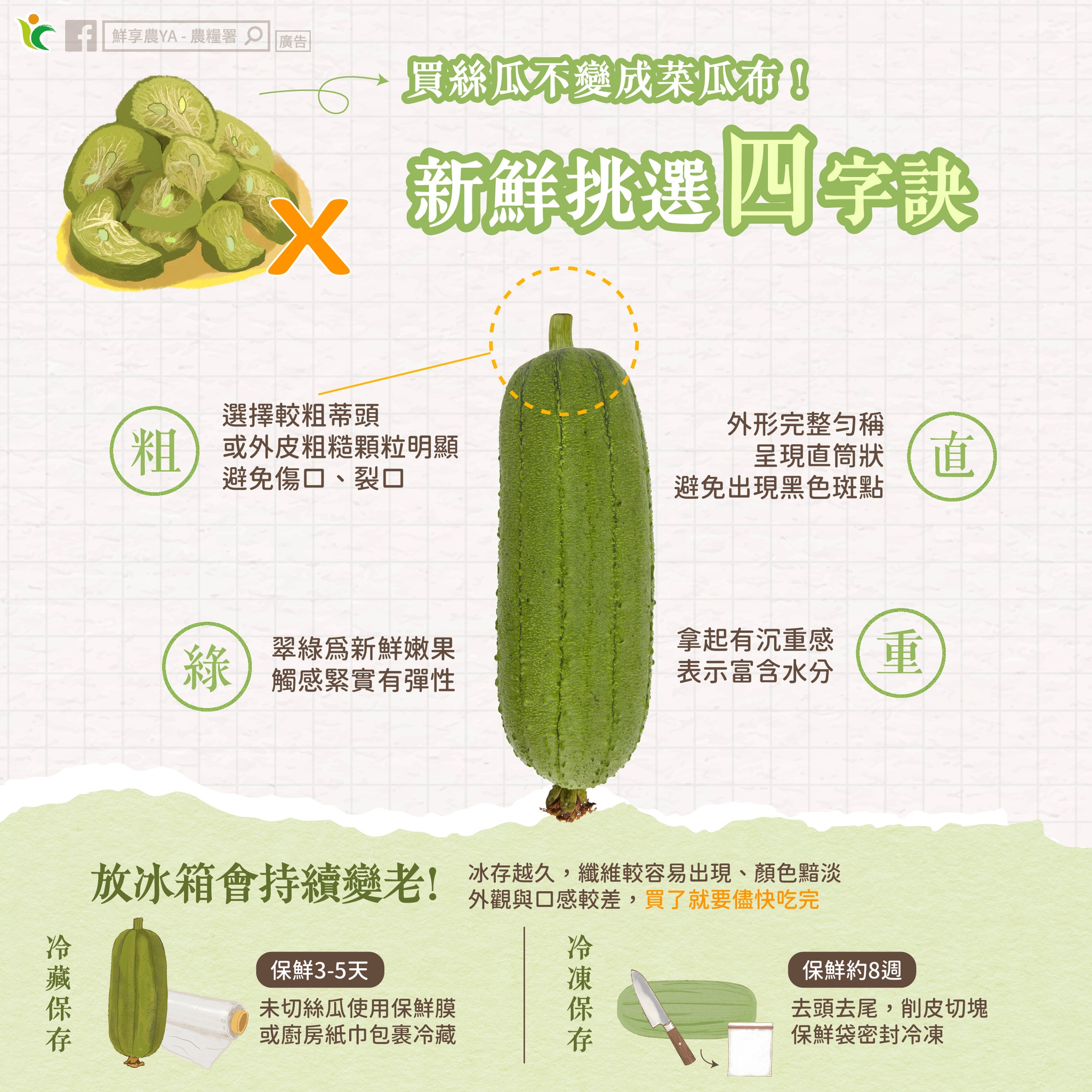 鮮享農YA - 農糧署提醒,絲瓜放冰箱還會持續變老,存越久,纖維較容易出現、顏色黯淡,外觀與口感較差,買了就要儘快吃完。