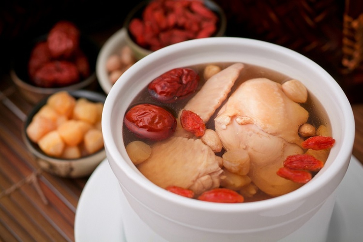 1.食材洗淨、處理後,先以雞骨及紅棗熬高湯,熬好後取出雞骨,再將所有菇類、黑木耳及枸杞加進沸騰的高湯中。