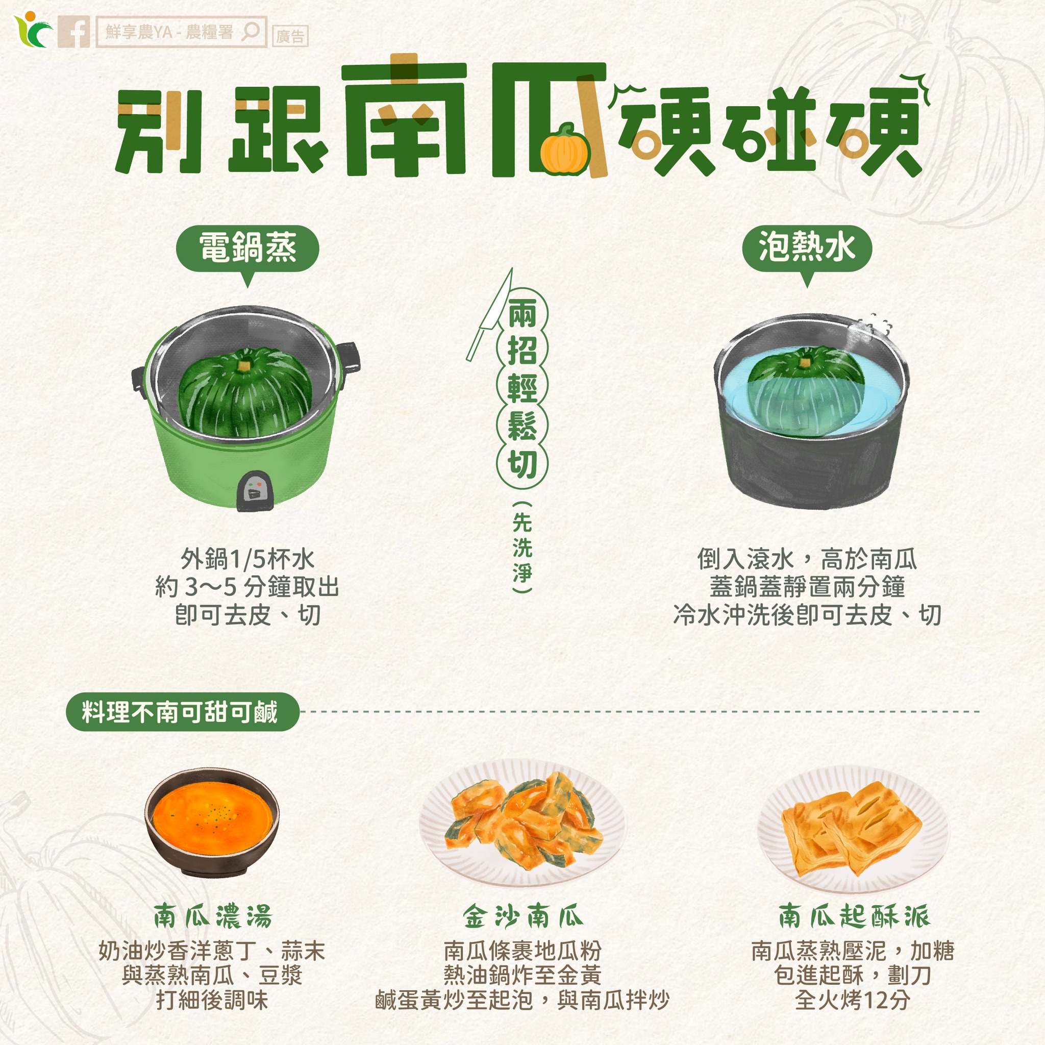 鮮享農YA - 農糧署分享,洗淨後的南瓜,可以用「電鍋蒸」或「泡熱水」兩個方法,軟化外皮、減少乳汁沾到手。