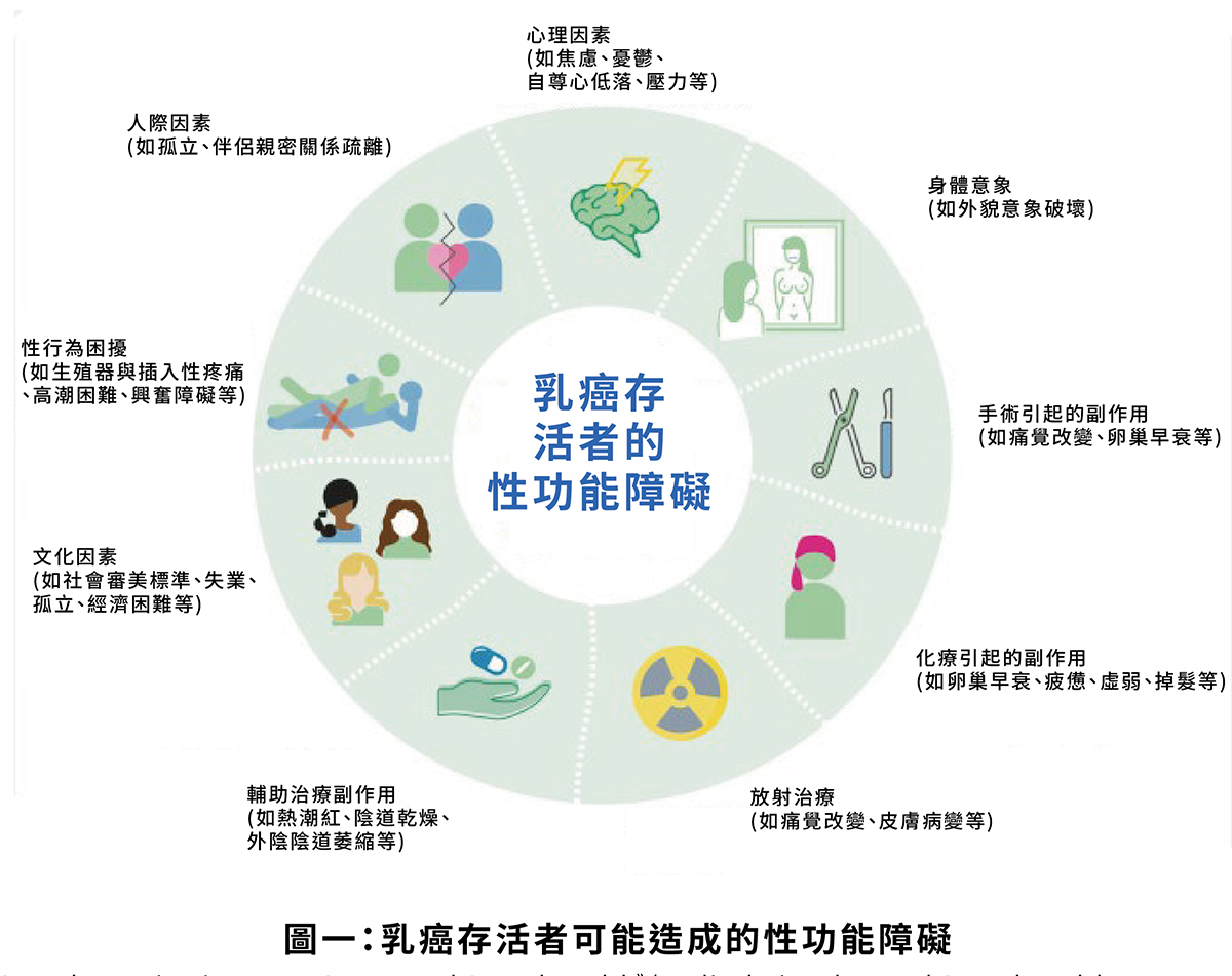 依據美國德州安德遜癌症中心2014年Dr.Sehoren報告,高達50%的乳癌患者經過治療後,導致長期發生的性功能障礙,從診斷乃至化學治療、荷爾蒙治療及外科手術過程,歷經煎熬,加上外觀改變,身體意象(Body image)缺損、失落,導致性慾喪失,以及缺乏對性親密的意願降低,其原因可能與手術、輔助化療、放療的副作用有關,其詳細內容包括: