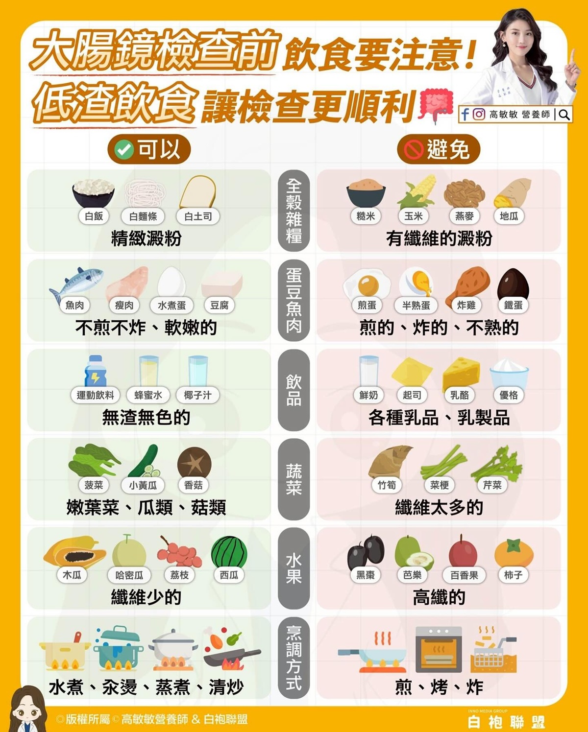 最近身邊越來越多人開始安排做大腸鏡,但很多人一聽到要檢查就緊張到不行!其實,只要前幾天執行低渣飲食,整個過程不但順利,還能讓醫師檢查更清楚。營養師高敏敏指出,簡單來說就是少纖維、少殘渣、好消化的飲食,幫助腸道在檢查前徹底清乾淨!