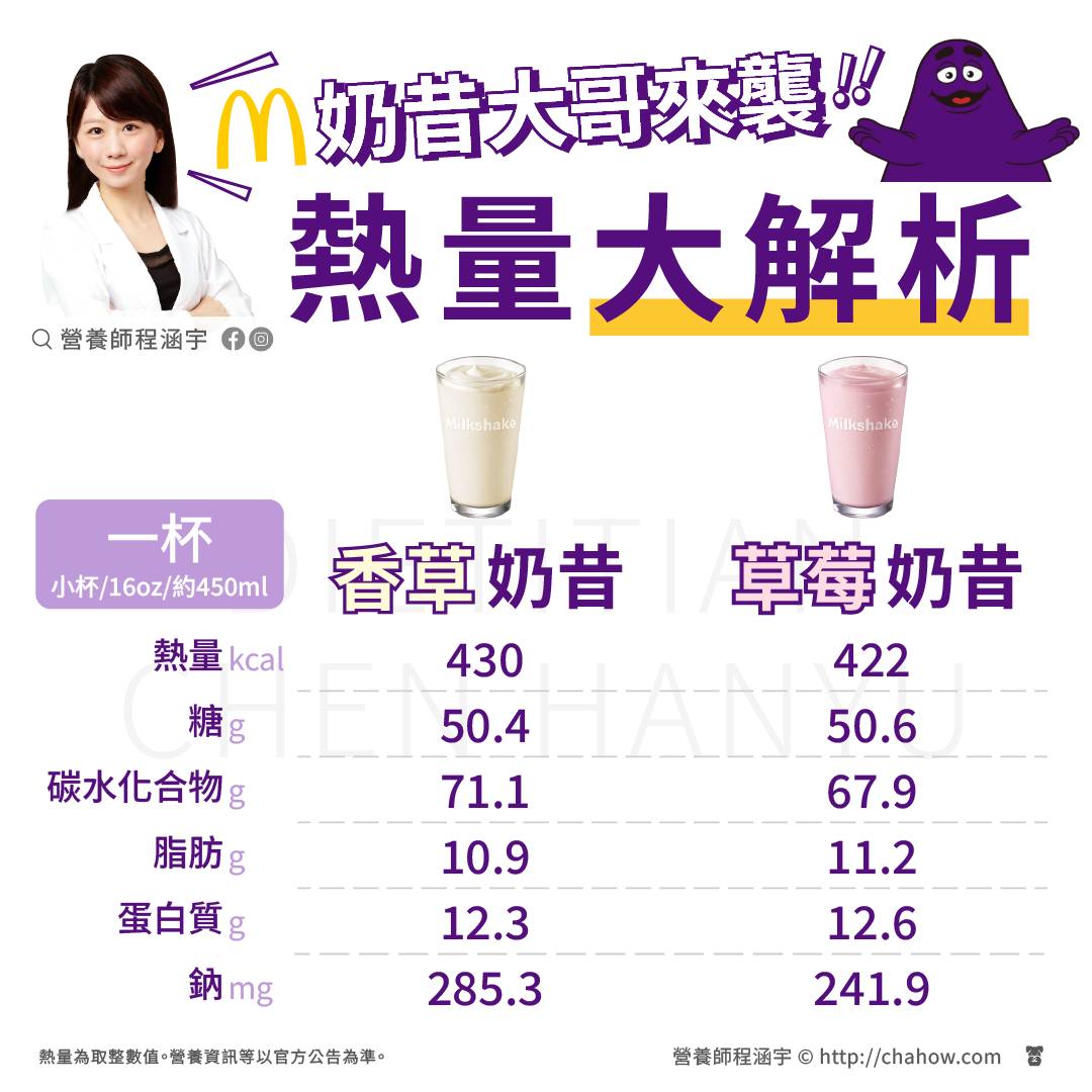 兩種口味的糖含量差異不大,以經典香草奶昔為例,糖大約在50.4g/杯。程涵宇說,跟可樂比,奶昔(50.4g) > 可樂(47.7g)