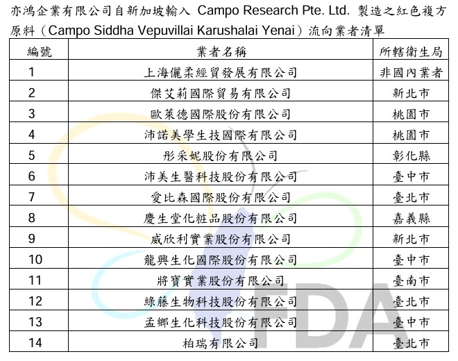 為嚴防問題產品擴散,食藥署已於11月20日要求該公司提供購買原料之相關下游廠商14家業者資訊,且要求下游業者須於48小時內完成清查並回報使用狀況,業者應強化自主管理,未經確認安全前,相關產品一律不得上架販售,食藥署將持續追蹤並依法嚴辦,以確保國內化粧品安全無虞。另為釐清是否尚有其他業者輸入新加坡Campo Research(Campo Cosmetics) 公司之問題原料,食藥署已於11月18日函請財政部關務署提供相關輸入報關資料,以利進一步追查。