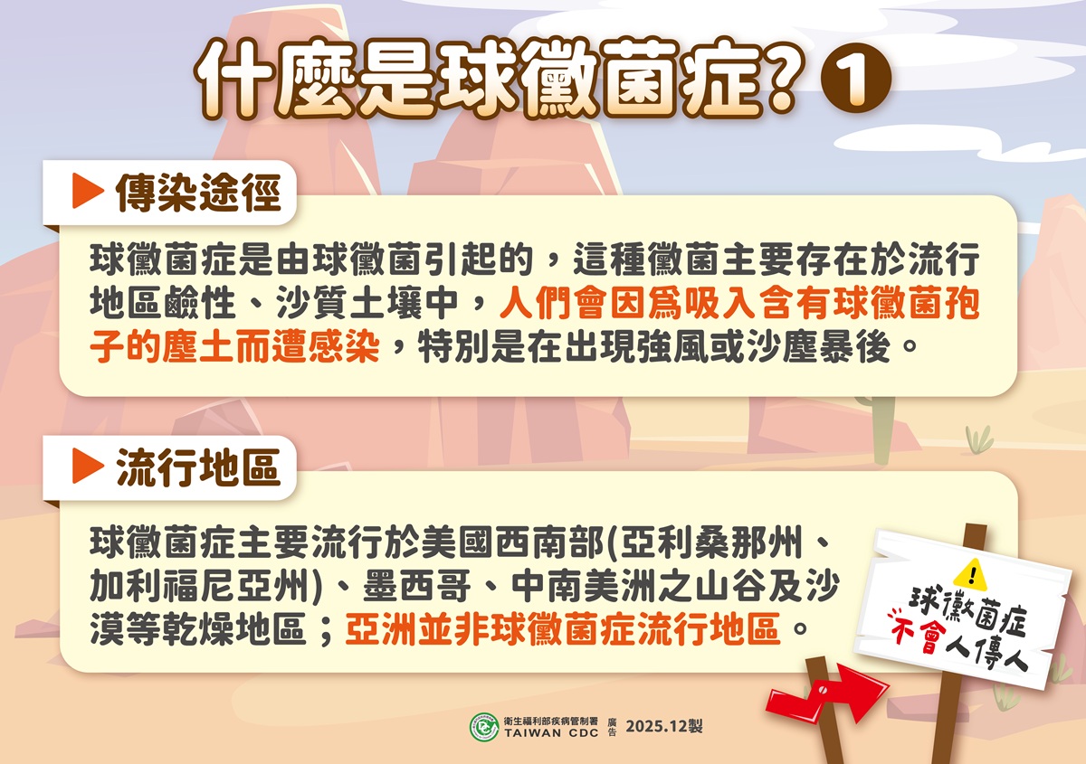 疾管署說明,球黴菌症為美國西南部、墨西哥、中南美洲之山谷及沙漠地區之流行病,存在於流行地區鹼性、沙質土壤中,主要透過吸入含球黴菌孢子之塵土而感染,特別是在發生強風或沙塵暴後,但不會在人與人之間造成傳染。多數感染者沒有症狀,約四成患者於潛伏期1至4週後出現發燒、疲倦、咳嗽、呼吸喘、頭痛、肌肉或關節痠痛、夜間盜汗、皮疹等症狀。少部分人(如免疫功能低下者、具糖尿病等慢性病患者、孕婦等高危險群)可能出現肺部或其他部位的嚴重感染。