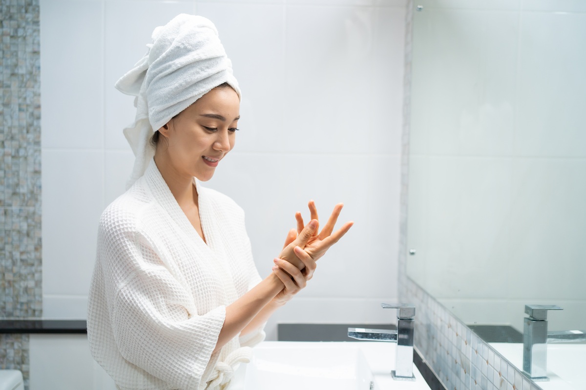 洗完澡馬上擦保濕產品(霜、乳、膏、液),可以鎖住皮表水分。有個統計,洗完澡七分鐘內擦上鎖水的產品,效果最好。因為洗完澡時,皮膚表面還有些水分,微濕的狀態,這時塗抹保濕產品效果會最好。至於怎麼樣的保濕產品,可以根據部位和天氣、個人需求來選擇。蔡逸姍建議,還是成份盡量單純、有效,比噱頭重要;而持續使用也是重點。