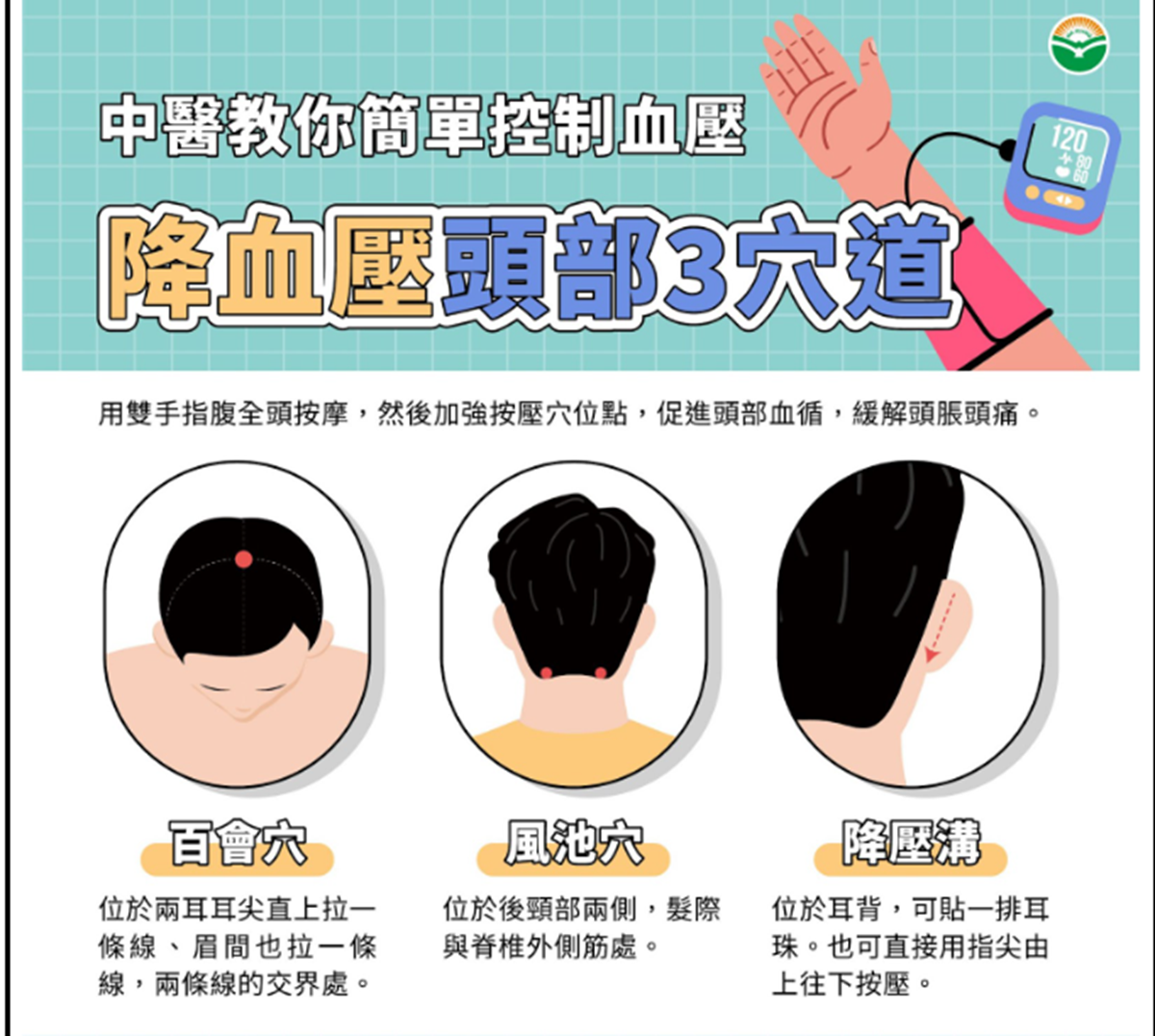 - 百會穴:位於兩耳耳尖連線與眉心中線交會處,有助於緩解頭脹、頭痛