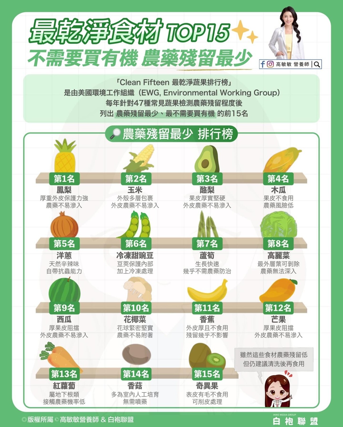 你知道有些食材其實「不用特別買有機」也能安心吃嗎?營養師高敏敏分享,這份由美國環境工作組織(EWG)每年公佈的Clean Fifteen最乾淨蔬果排行榜,是針對47種常見蔬果檢測農藥殘留後,列出的「農藥殘留最少」前15名!
