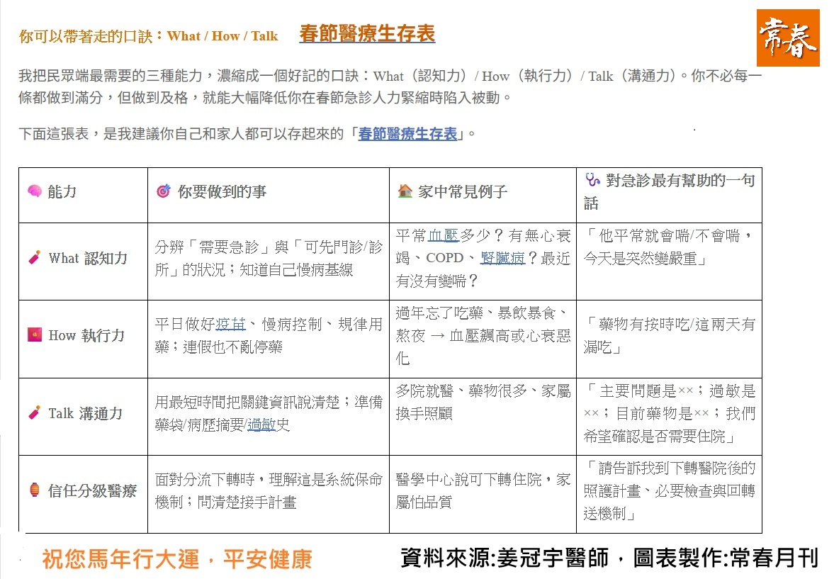 我把民眾端最需要的三種能力,濃縮成一個好記的口訣:What(認知力)/ How(執行力)/ Talk(溝通力)。你不必每一條都做到滿分,但做到及格,就能大幅降低你在春節急診人力緊縮時陷入被動。