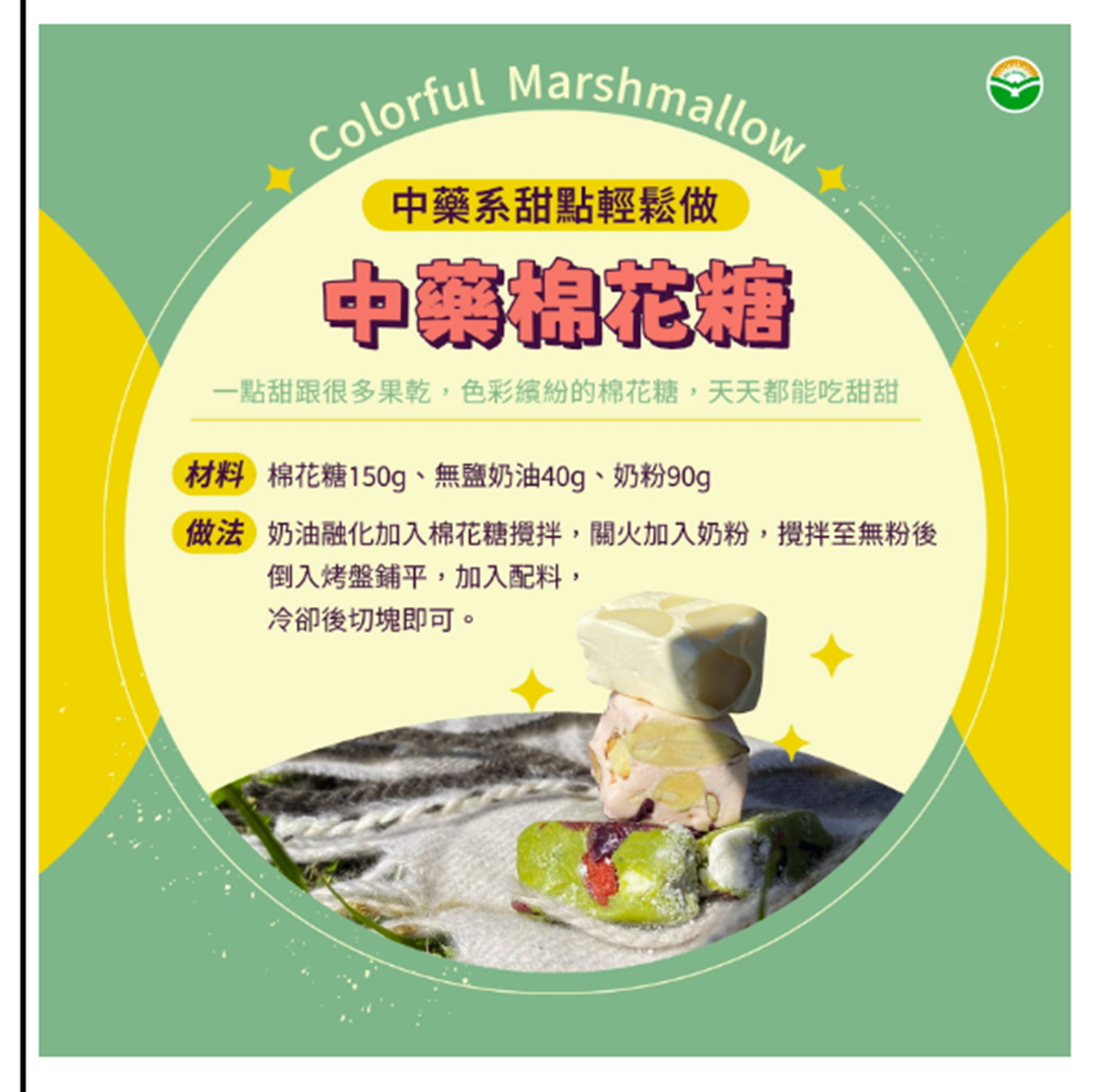 作法包括融化奶油、加入棉花糖拌勻,再加入奶粉與配料,鋪平冷卻後切塊即可。
