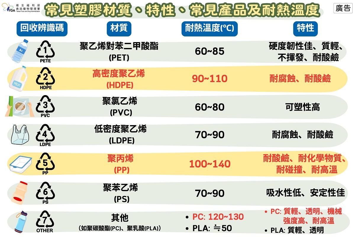 衛生福利部食品藥物管理署署長姜至剛表示,民眾常見自備的食品容器具材質包括塑膠、不鏽鋼及玻璃等,各類材質於耐熱性及使用方式上有所差異。因此提醒,重複使用之食品容器具,使用時應把握「讀、洗、換」三原則,以確保食品衛生安全: