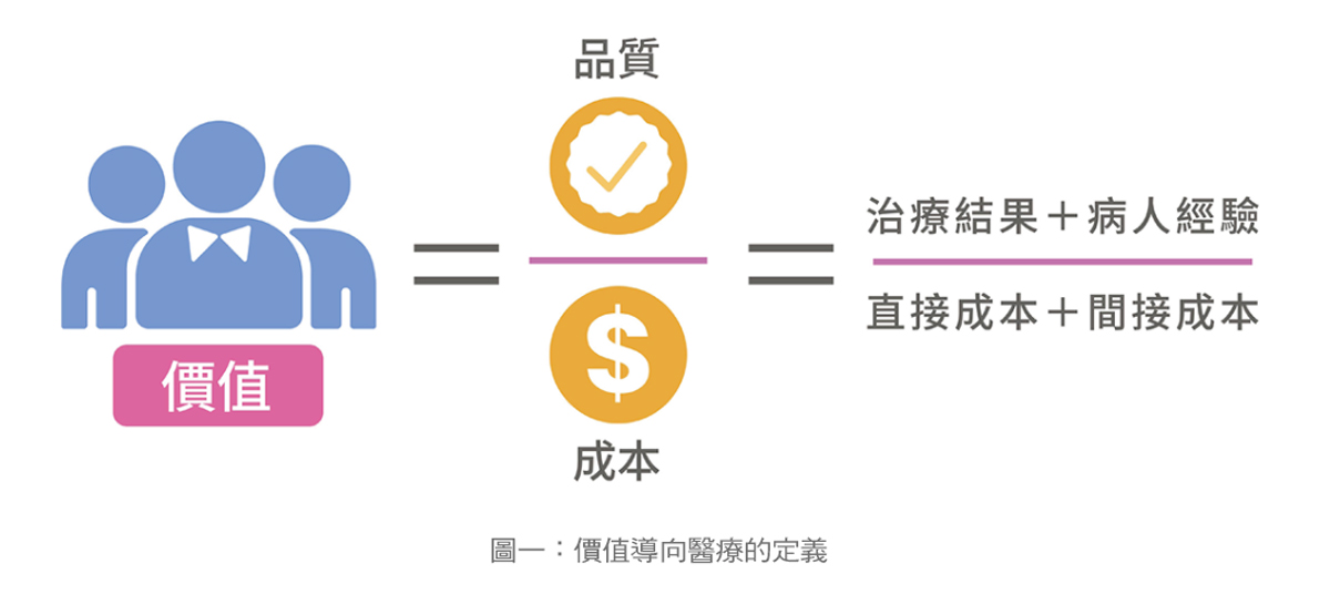價值導向無論是照護或醫療(VBHC或VBM)源於2006年由麥克‧波特及伊莉莎白‧泰斯伯格著作的《醫療革命》一書中所提出。為了解決傳統「按服務量計費(Fee-for-Service)」導致醫療成本高漲、效率低下及醫療品質不一等問題,他們倆人主張的核心理念是醫療從「服務數量」轉向「病人健康成效」,其定義為:價值 = 病人健康結果∕該健康結果所耗費成本 (見圖一),其核心目標在於「以合理成本達成最佳健康結果」,而後獲得大家廣泛支持。