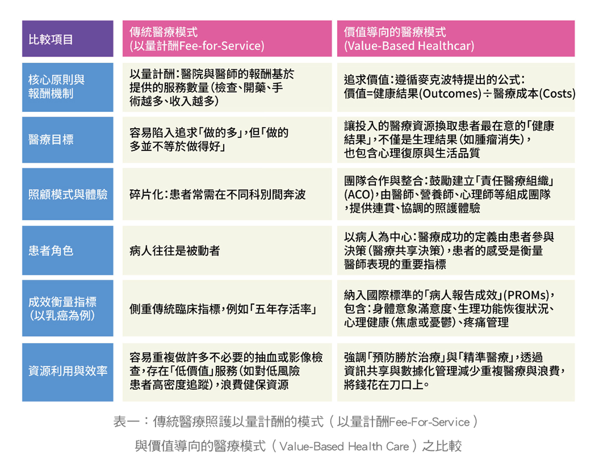 乳癌診療在過去二十年快速進步,手術、放療、化療、標靶、內分泌及免疫治療,乃至於乳房腫瘤整形及乳房重建手術不斷精密且細緻化,使整體存活及生活品質顯著改善。然而,當多種治療策略在存活率不斷提升之際,患者仍有治療期間及治療後,急、慢性等副作用,以及財務衝擊,乃至於職場及社會適應的多種挑戰,他們能否重返正常的健康狀態仍面臨極大考驗,這正是於2006年由麥克‧波特(Michael Porter)及伊莉莎白‧泰斯伯格(Elizabeth Teisberg)等在《醫療革命》著作中所倡議的價值導向照護(Value-Based Healthcare, VBHC)或價值導向醫療(Value-Based Medicine, VBM)要面對的核心議題:醫療不該只比「做了多少」,而是要比「帶來多少病人滿意的結果」。