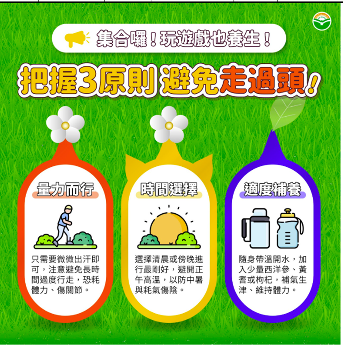 2️.避開高溫:建議清晨或傍晚活動
