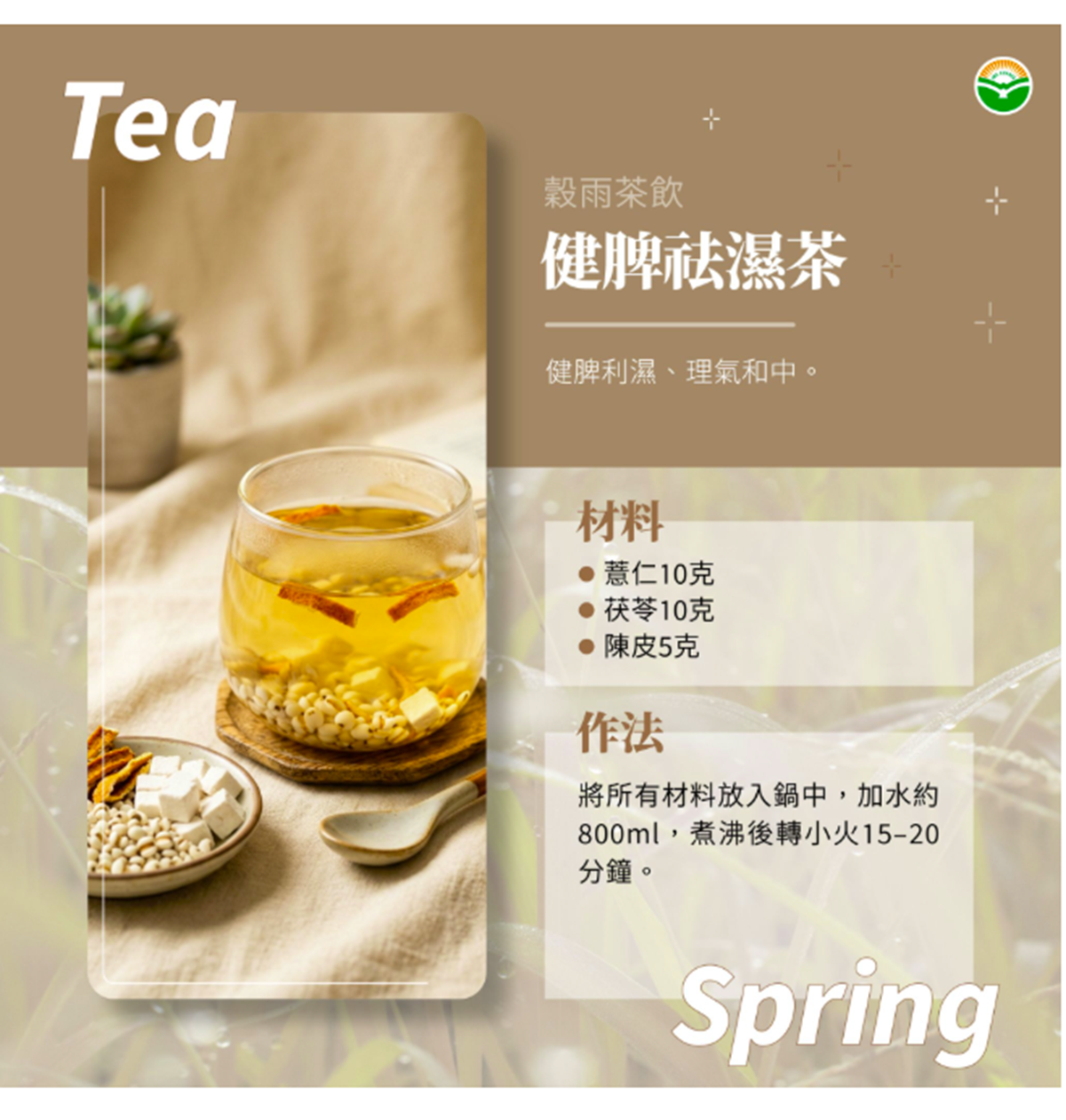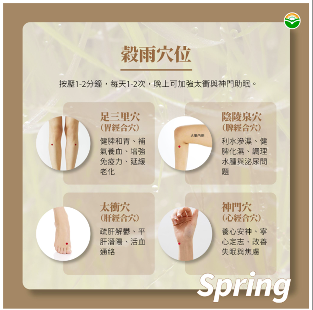 穀雨為春夏交替關鍵節氣,氣溫升高、濕氣加重,易出現疲倦、食慾差、腹脹、濕疹與情緒煩躁等問題。中醫認為此時應以「健脾祛濕、疏肝清熱、安神養心」為調理重點。可透過薏仁、茯苓等食材入茶飲,搭配穴道按摩與規律作息,幫助身體順利轉換季節、減少不適,為迎接夏季打下良好基礎。