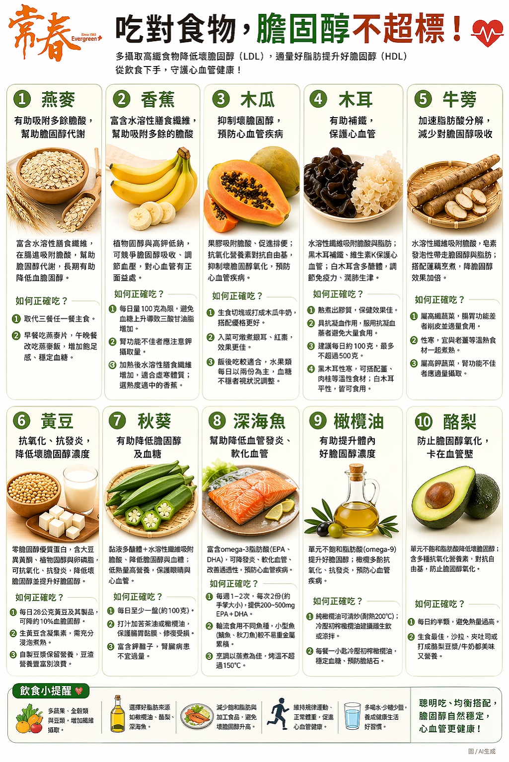 吃對食物,膽固醇就能維持在標準範圍之內。日常飲食中應多攝取高纖維食物,如燕麥、豆類、蔬果與全穀類,有助於降低壞膽固醇(LDL);同時攝取適量的好脂肪,如橄欖油、酪梨與深海魚,可提升好膽固醇(HDL)。想要維持心血管健康,從飲食下手是關鍵。