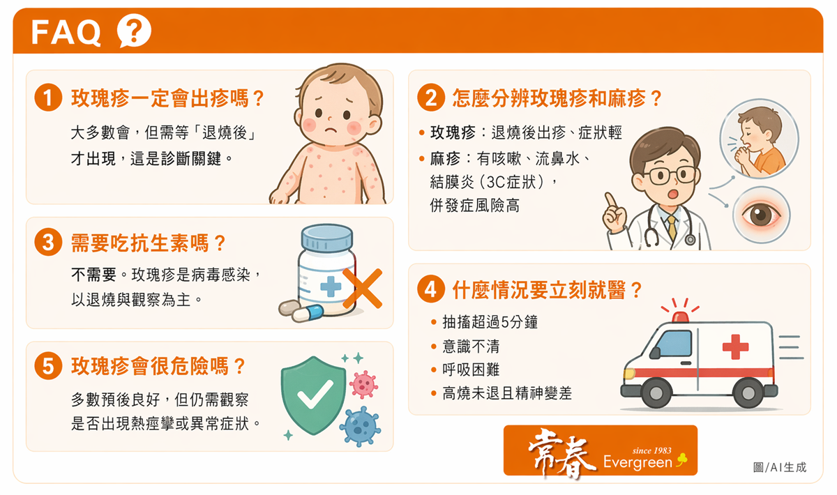 治療方面,玫瑰疹以症狀照護為主,透過退燒藥減輕不適並持續觀察。3C症狀提醒,約3%至13%個案可能因高燒引發熱痙攣,若持續超過5分鐘或伴隨意識不清、呼吸困難,應立即送醫。