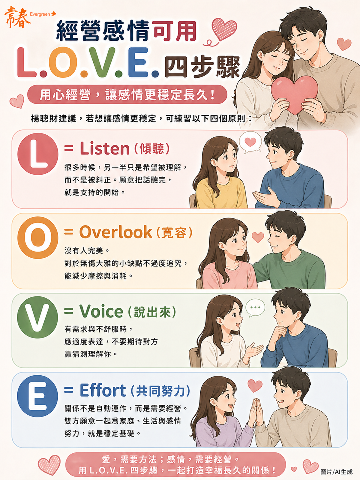 楊聰財建議,若想讓感情更穩定,可練習以下四個原則: