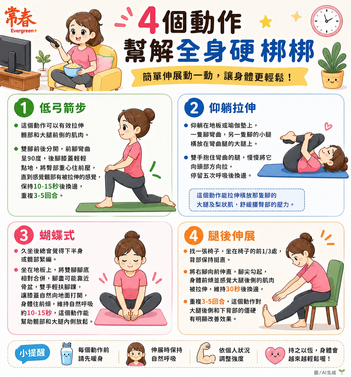 宅在家追劇似乎成了不少人的日常,但長時間保持同一姿勢,身體難免會感到緊繃僵硬不適,其實只要花幾分鐘做一些簡單的伸展運動,就能有效緩解疲勞,幫助身體恢復輕鬆!