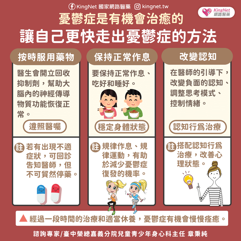 一旦確診罹患憂鬱症,章秉純建議,可從三方面來幫助自己更快走出憂鬱,一是按時遵照醫囑服用藥物,通常醫生會開立回收抑制劑,幫助大腦內的神經傳導物質功能恢復正常,若有出現不適症狀,可回診告知醫師,但不可貿然停藥;此外,患者要保持正常作息、吃好和睡好,讓身體保持在健康穩定的狀態,才能減少憂鬱症復發的機率;此外,也可以在醫師的引導下,改變負面認知、調整思考模式、控制情緒,使生活獲得正面的效果。