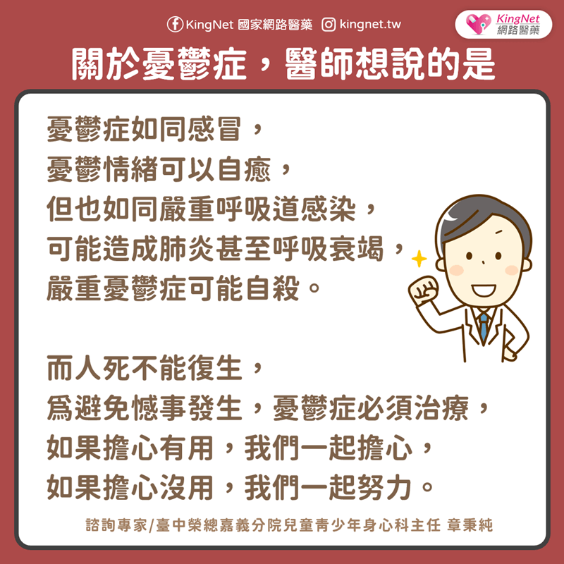 章秉純表示,經過一段時間的藥物治療、適當的休養和改變認知,憂鬱症就有機會慢慢痊癒,找回患者自己原來的生活。