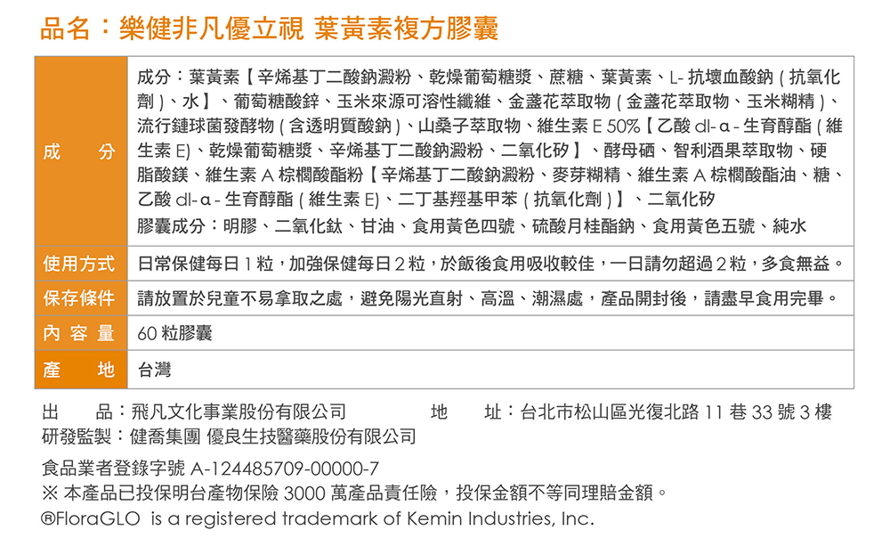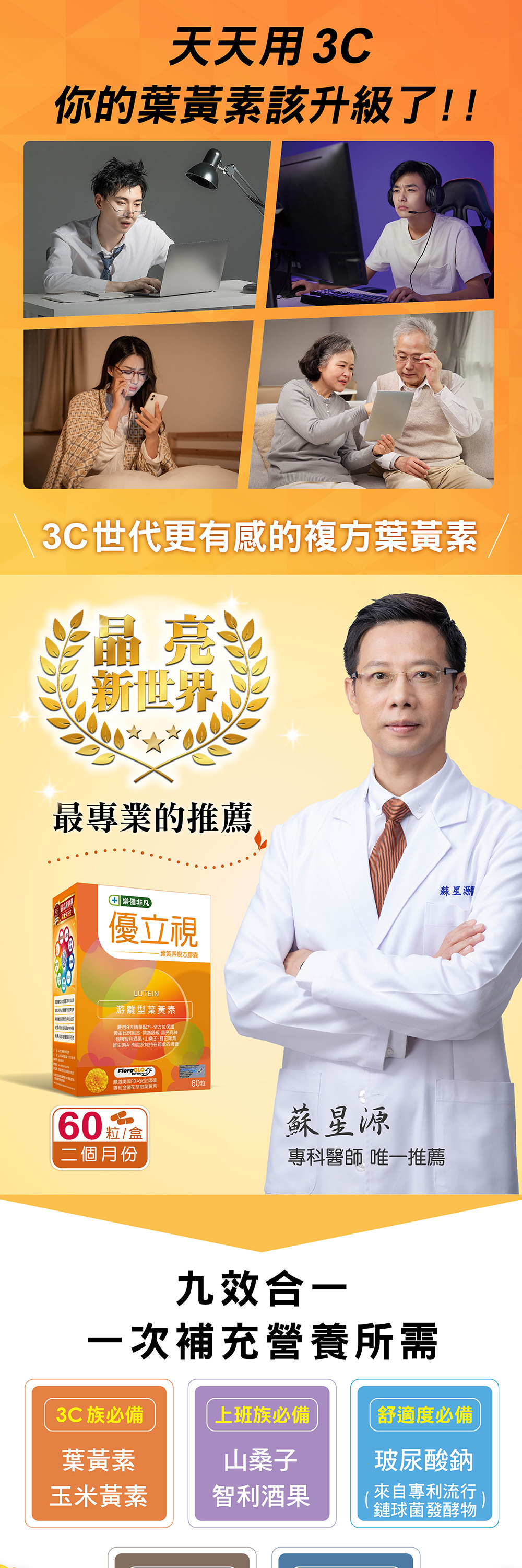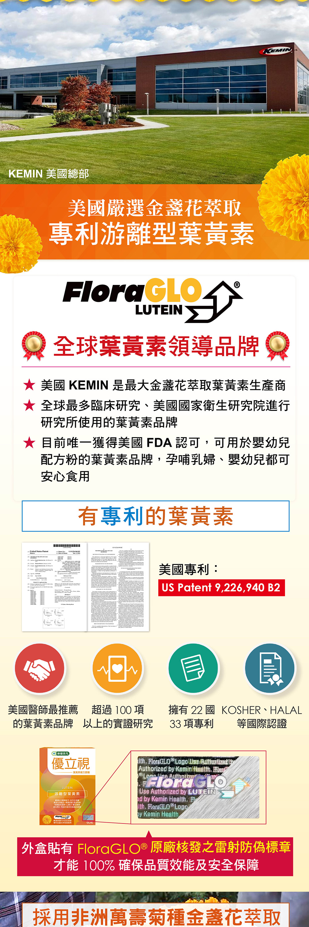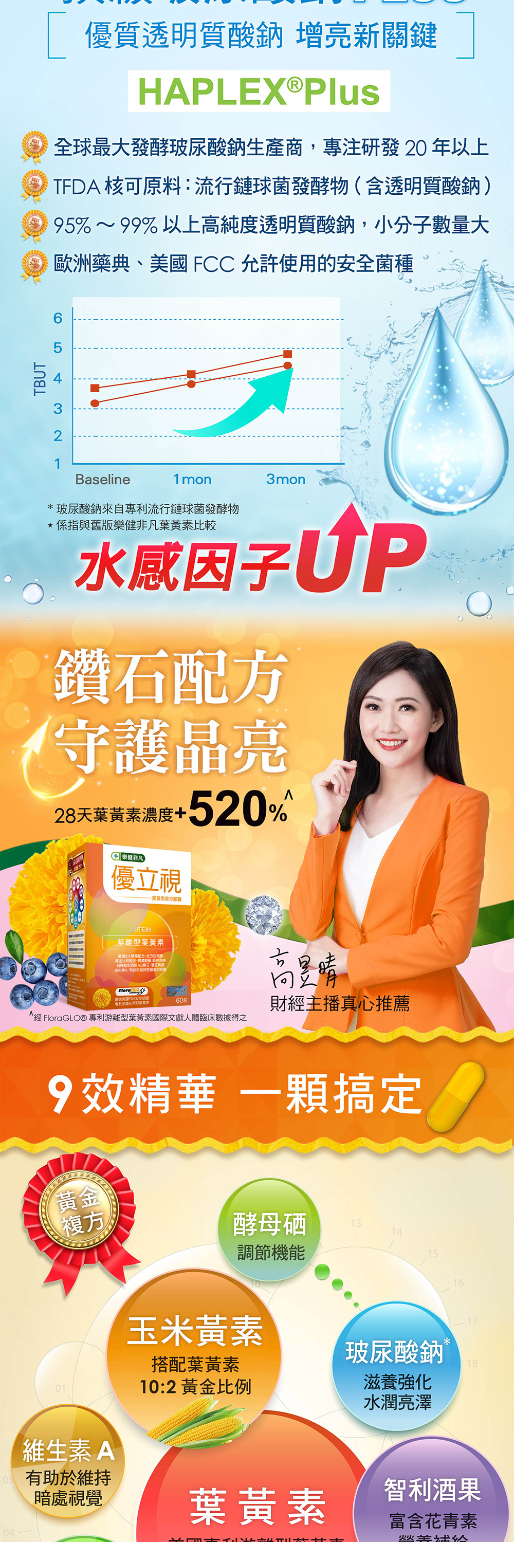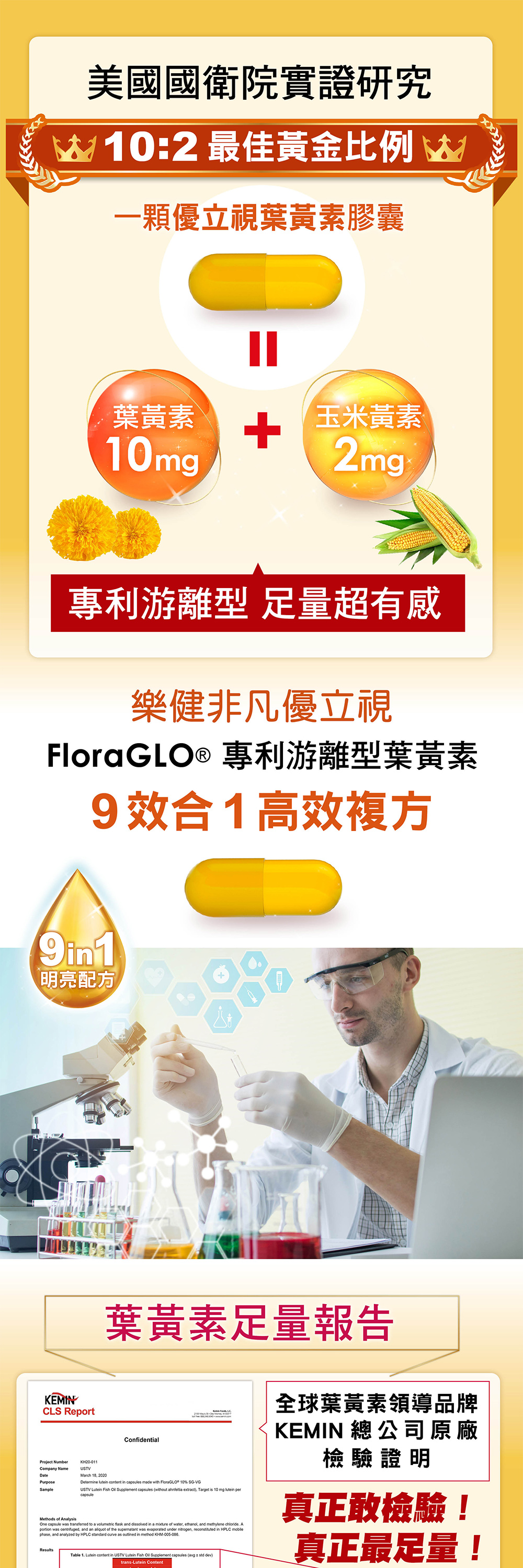 專利葉黃素9效合1 | 嚴選美國FloraGlo®專利游離型葉黃素+雙花青素+玻尿酸三管齊下 | 水潤舒適,晶亮有神