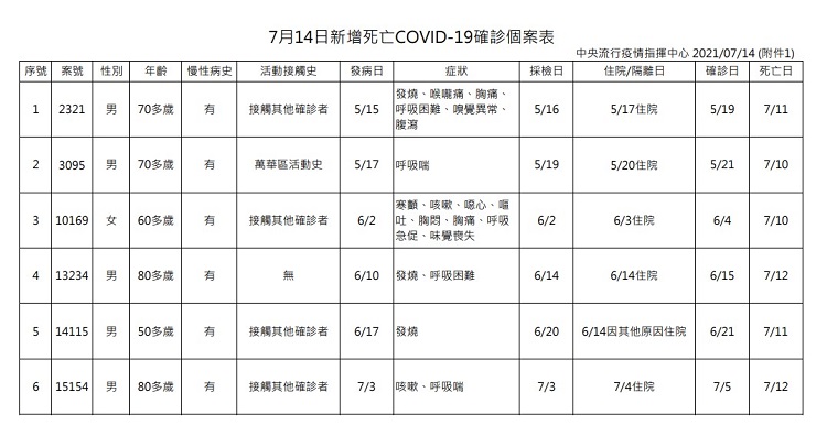 指揮中心說明,今日新增6例死亡個案,為5例男性、1例女性,年齡介於50多歲至80多歲,發病日介於5月15日至7月3日,確診日介於5月19日至7月5日,死亡日介於7月10日至7月12日。