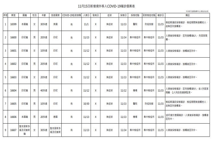 指揮中心說明,今日新增9例境外移入個案,為5例男性、4例女性,年齡介於10多歲至40多歲,分別自美國(案16599)、印尼(6例,案16600至案16605)、德國(案16606)、聖克里斯多福及尼維斯(案16607)入境,入境日介於今(2021)年10月30日至11月13日,皆持有搭機前3日內檢驗陰性報告。