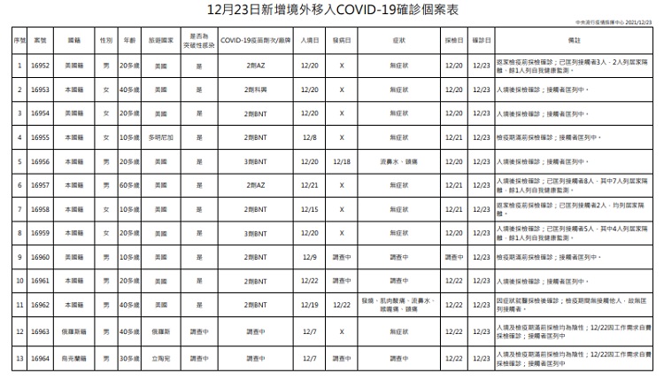 指揮中心說明,今日新增13例境外移入個案,為8例男性、5例女性,年齡介於10多歲至60多歲,分別自美國(10例,案16952-16954、案16956-16962)、多明尼加(案16955)、俄羅斯(案16963)、立陶宛(案16964),入境日介於今(2021)年12月7日至12月22日。