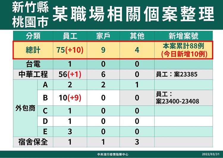 指揮中心說明,今日新增境外移入個案為72例男性、79例女性、1例調查中,年齡介於未滿5歲至70多歲,分別自越南(62例)、印尼(23例)、香港及泰國(各5例)、日本、新加坡、德國、荷蘭、韓國、以色列、菲律賓及美國(各2例)、南非、英國、巴基斯坦、中國、波蘭及澳大利亞(各1例)移入,另35例調查中。入境日介於今(2022)年3月18日至3月30日。