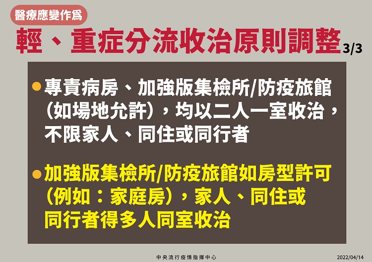鑒於近期本土疫情升溫,面對Omicron病毒株以輕症及無症狀為主的快速傳播模式,中央流行疫情指揮中心今(14)日表示,為擴大醫療應變量能,強化輕重症分流,以確保醫療量能及確定病例即時獲得醫療照護,即日起調整COVID-19確定病例輕重症分流收治條件,說明如下: