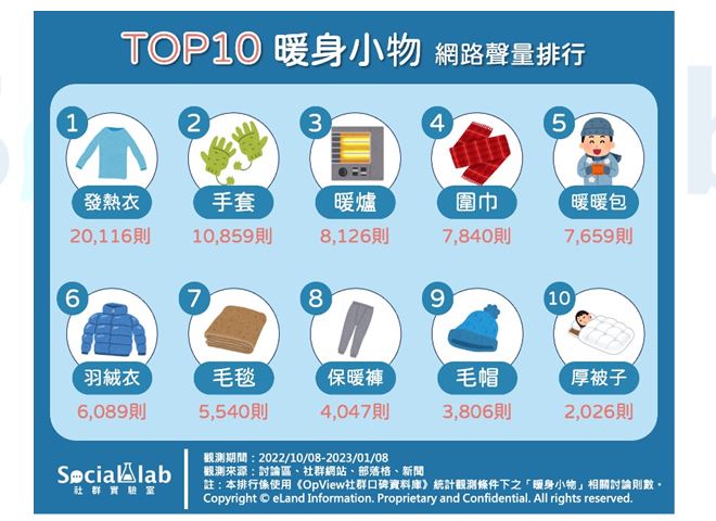 《Social Lab社群實驗室》本次透過《OpView社群口碑資料庫》追蹤近三個月內「暖身小物」相關話題聲量,帶您了解網友熱議的抵抗手腳冰冷超有用的10大暖身小物。