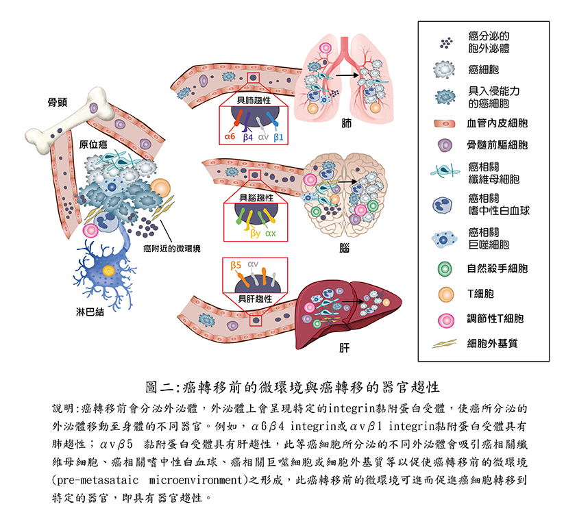 然而,實驗研究和臨床醫學上的歸納都無法明確指出癌轉移中器官趨性的特定模式,癌轉移到特定器官的明確機制也不明。直到西元2015年,台灣大學沈湯龍教授與美國康乃爾大學David Lyden團隊的共同研究,終於證實癌細胞在進行癌轉移前所分泌的外泌體,透過其所呈現的特定integrin黏附蛋白受體,展現其對身體內不同器官專一性的趨性,進而外泌體的生物分子能傳遞到特定的遠端器官,藉由改造特定遠端器官內訊息傳遞分子的活性或基因表現的能力,以形成適合的轉移前的微環境,提供後續癌轉移的器官趨性(圖二)。