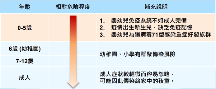 .嬰幼兒-餵食不佳、發燒、抽搐、嗜睡、發紺、黃疸、躁動不安、膚色蒼白;嬰兒不太會出現典型手足口病及疱疹性咽峽炎, 且高達80%無症狀。