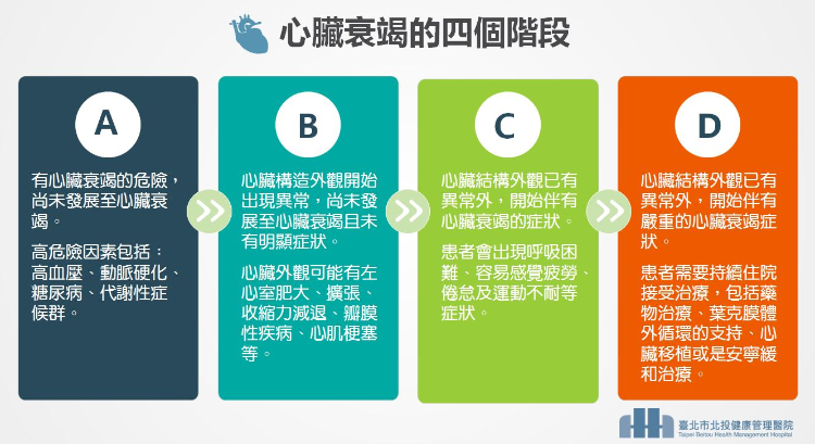 心臟衰竭分成四個階段,若達到第四級的時候平均五年存活率只剩下50%,死亡率比癌症還高。美國心臟協會將心臟衰竭分成四個階段: