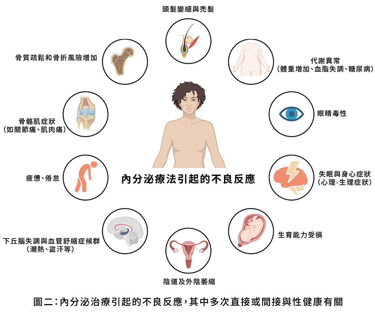 ➊荷爾蒙治療、化學治療、標靶治療的藥物可能有噁心、疼痛、疲勞等副作用,加上治療期間心理上可能有恐懼、沮喪、失落、焦慮等,使癌友不太可能想要以任何形式的性活動或任何方式感受到性行為。以荷爾蒙治療為例,如(圖一)、(圖二)所示,可能引起很多相關副作用,其中很多與性健康有關。