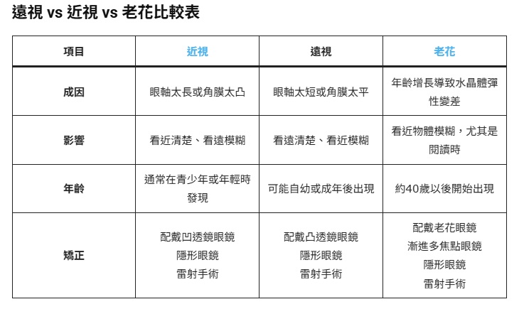 粘靖旻說明,這三種視力問題的主要差別在於光線在眼睛裡聚焦的位置,近視是光線聚焦在視網膜前方,所以看遠的東西不清楚;遠視則是光線聚焦在視網膜後方,影響看近的清晰度;而老花是隨著年齡增長,眼睛的調節能力變差,無論原本是近視或遠視,通常40歲後都會逐漸出現閱讀困難的情況。每種情況的矯正方式也不同,需要依照個人需求選擇。
