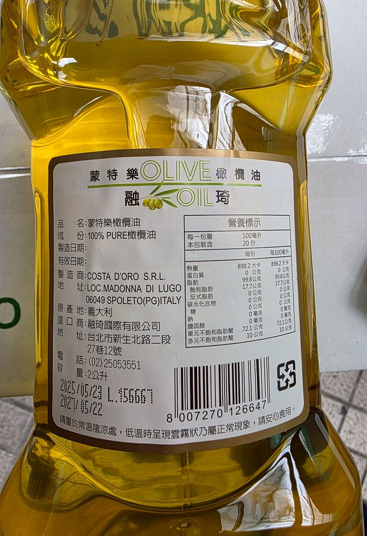 經查,業者進口「蒙○樂橄欖油」後,混合「芥花油」重新分裝,產品卻標示為「蒙○樂橄欖油」,並標示成分為「100% pure橄欖油」對外販售,涉有攙偽及標示不實情事。