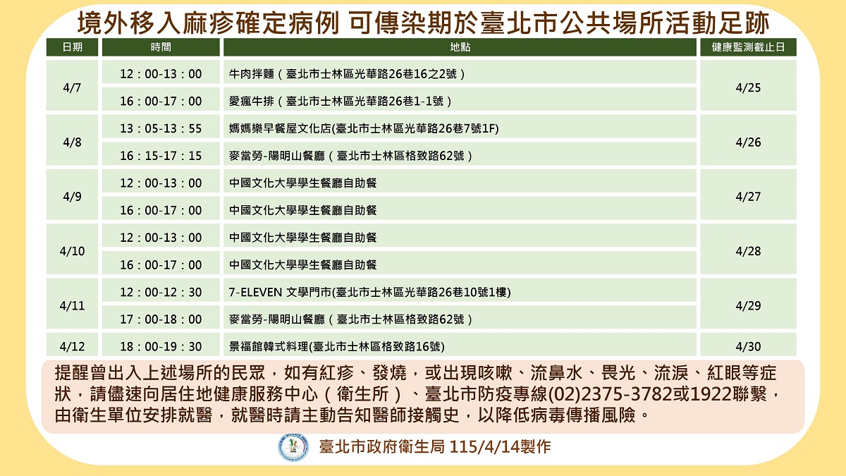 北市衛生局說明個案於可傳染期間有公共場所活動史,相關場域均已加強清消,提醒曾與個案足跡重疊者,請進行自主健康監測至4月30日。