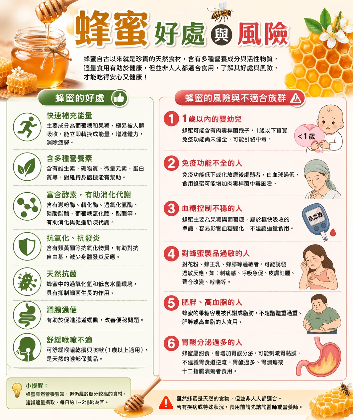 本身免疫功能低下或是化放療後虛弱的人,因為身體白血球過低,也不建議食用蜂蜜,原因同樣是擔心肉毒桿菌中毒。