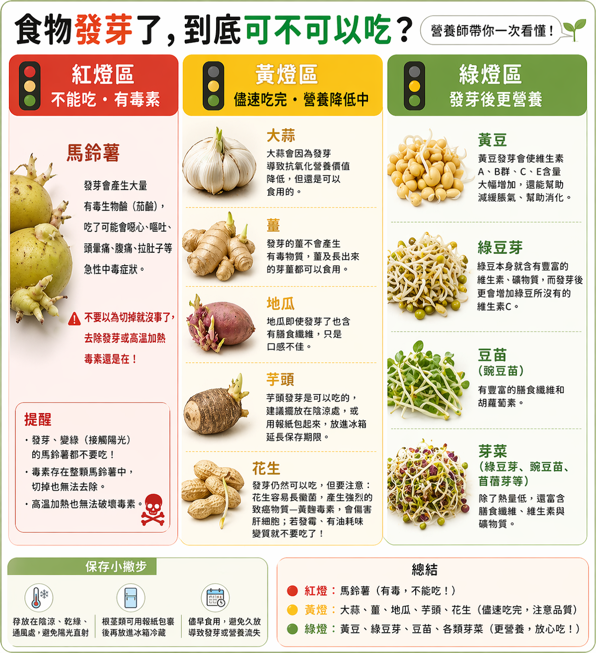‧馬鈴薯:發芽會產生大量有毒生物鹼,吃了可能會噁心、嘔吐、頭暈痛、腹痛、拉肚子等急性中毒症狀,千萬不要以為切掉就沒事了,去除發芽或高溫加熱毒素還是在。