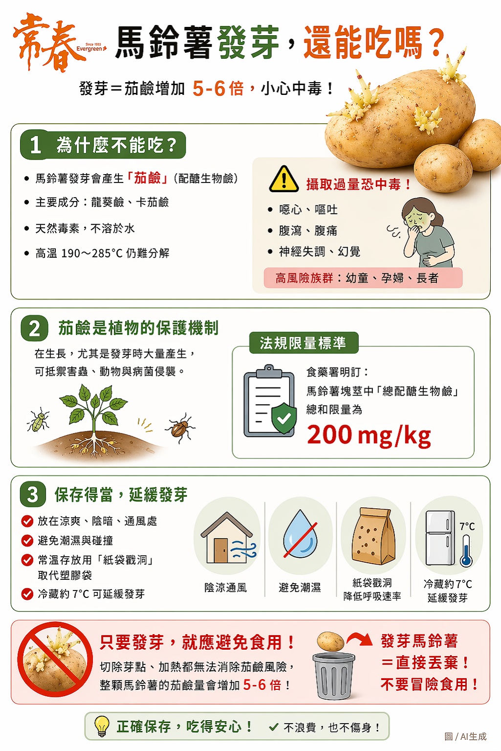 而為加強管理,食藥署也明文訂定「食品中污染物質及毒素衛生標準」,訂定馬鈴薯塊莖中總配醣生物鹼之總和限量為200mg/kg。
