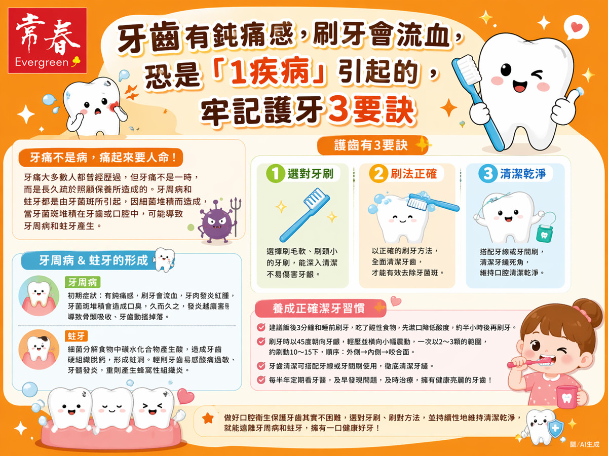 牙痛多與牙菌斑堆積有關,常見原因為牙周病與蛀牙,嚴重恐導致牙齒脫落或感染。預防關鍵在於選對牙刷、使用正確刷牙法並徹底清潔,搭配牙線與牙間刷效果更佳。建議飯後與睡前刷牙,酸性食物後延後刷牙,並每半年定期檢查,守護口腔健康。