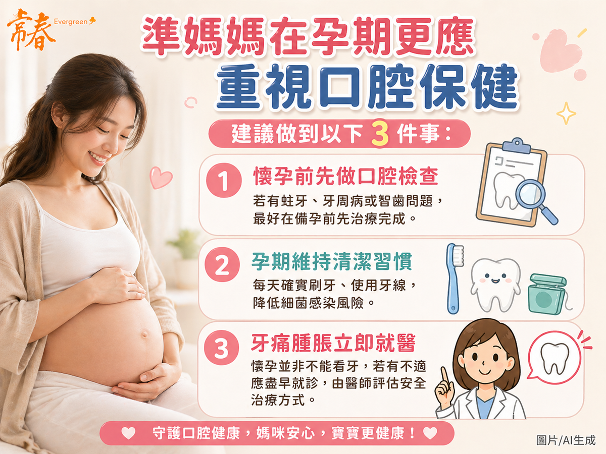 李曉屏強調,牙齒問題看似局部不適,但感染可能牽動全身健康。孕期若出現牙痛、腫脹、咀嚼困難等症狀,切勿自行忍耐或拖延治療,及早處理,才能守護媽媽與寶寶的健康。」