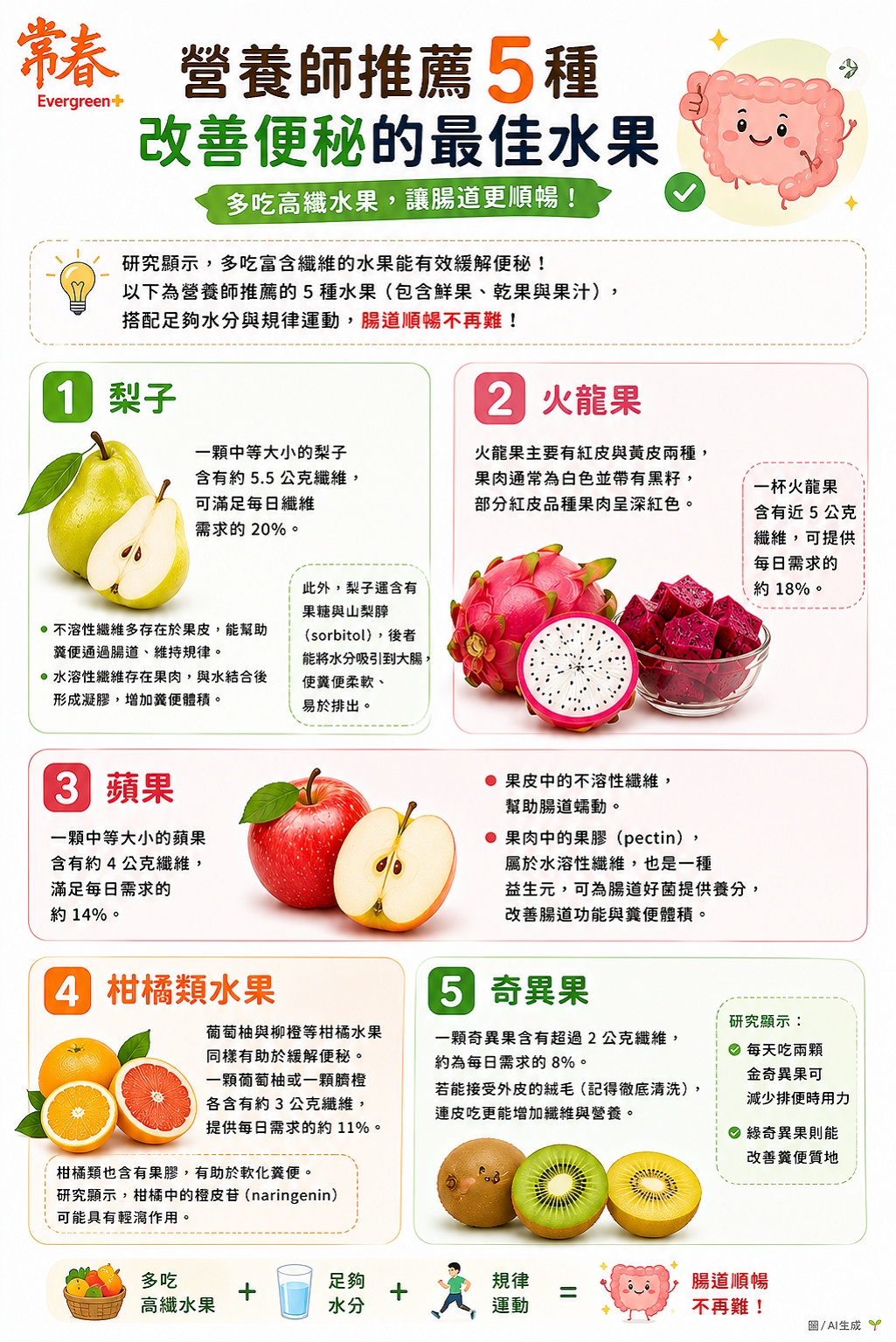 好消息是,研究顯示,多吃富含纖維的水果能有效緩解便秘。以下為營養師推薦的5種改善便秘的最佳水果(包含鮮果、乾果與果汁)。但除了多吃這些高纖水果,記得搭配足夠水分與規律運動,才能更有效地預防與改善便秘。