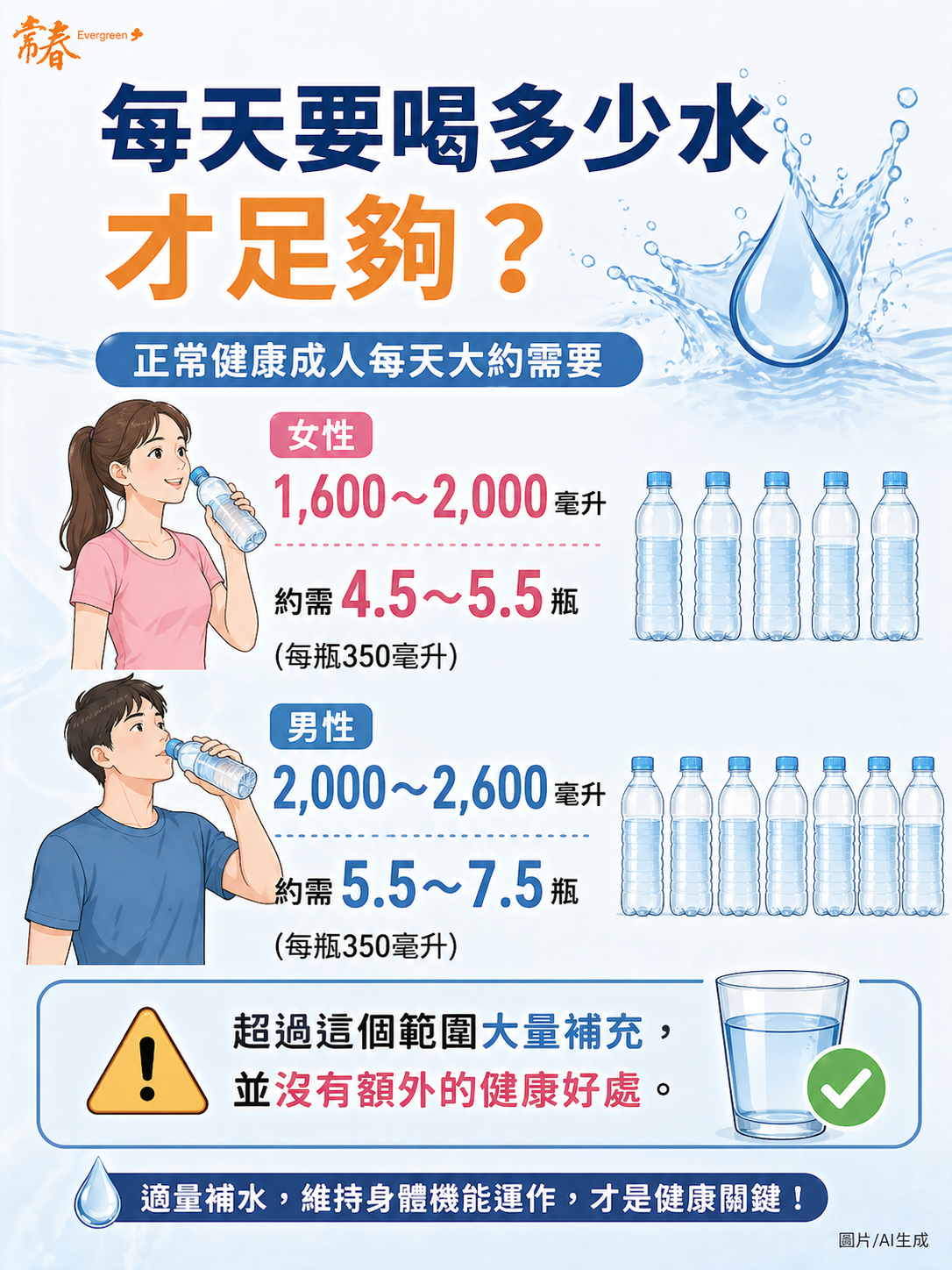 提醒你:正常健康成人每天大約需要1,600~2,000毫升(女性)到2,000~2,600毫升(男性)的液態水。換算成350毫升瓶裝水,女性每天約需4.5~5.5瓶,男性約需5.5~7.5瓶。超過這個範圍大量補充,並沒有額外的健康好處。