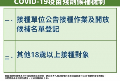 中央流行疫情指揮中心指揮官陳時中在6月22日宣布,7月1日起擴大疫苗施打對象,包括65歲至74歲長者、曾打第一劑者以及教師、郵差、國家關鍵設施必要人員等均可接種。